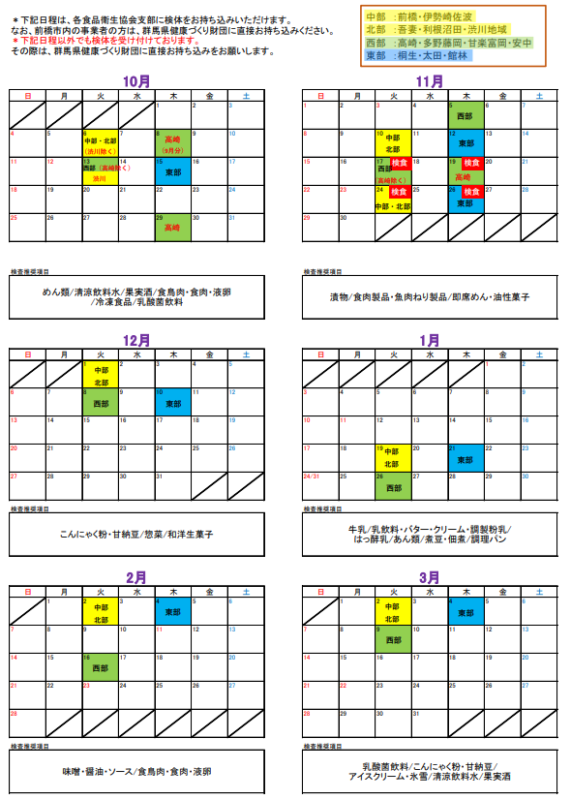 詳細はPDFファイルをご覧ください。カレンダーに記載されている月日は、群馬県食品衛生協会各支部に検査物をお持ち込みいただくことができます。なお、前橋市内の事業者の方は当財団に直接お持ち込みください。
